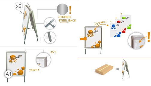 Reklamna A stojala so najbolj priljubljena in najbolj prodajana stojala za oglaševanje. Klip reklamna stojala postavimo pred trgovino. S tem dosežemo, da z oglaševano vsebino ogovorimo tudi tiste mimoidoče, ki niso imeli namena kupiti naš izdelek ali storitev. Tako v njih vzbudimo potrebo in jih povabimo v trgovino. Reklamno stojalo ima aluminijasto ohišje in preklopne klip robove za hitro vstavljanje in menjavanje plakatov ali drugega oglasnega materiala. Priložena plastična folija ščiti plakat pred prahom in umazanijo. Tabla ima izjemno stabilno konstrukcijo, zato je uporabna tako za postavitev v notranjih prostorih kot na prostem, vendar ne sme biti izpostavljena neposrednemu dežju. Odlikuje jo enostavno čiščenje.