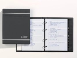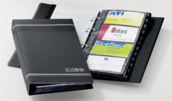 Album za vizitke z mat površino z okrasnimi srebrnimi črtami z 12 vložnimi žepki (do 48 vizitk enostransko vstavljanje ali 96 vizitk obojestransko vstavljanje) ter ojačanimi žepi.