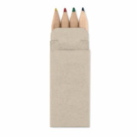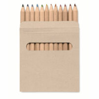 Set dvanajstih barvic pakiranih v kartonski škatli in šilčkom na pokrovu škatle.