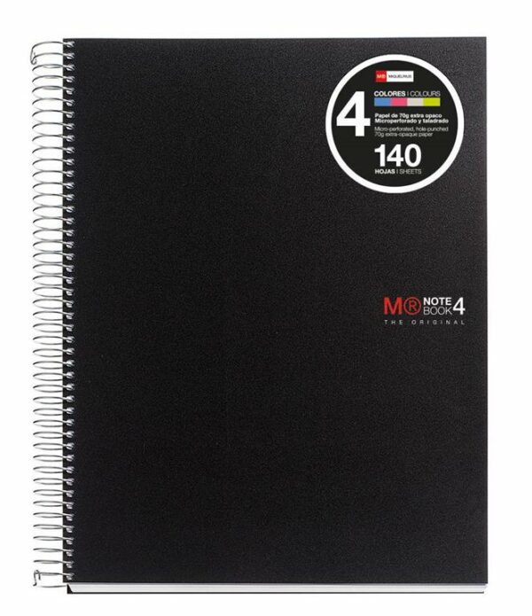 Visoko kvaliteten špiralni blok MiquelRius s špiralo na strani, primeren za pisarniško, šolsko, domačo uporabo kot tudi za profesionalne uporabnike. Izdelan je iz kvalitetnega 80g papirja s pvc barvno platnico iz neprosojnega polipropilena (PP) debeline 0,8 mm. Vsebuje 140 listov papirja debeline 80g/m2 z mikro perforacijo za lažje trganje in 4 luknje za vstavljanje listov v mapo. Robovi papirja v šestih različnih barvah, vsake barve 25 listov.
