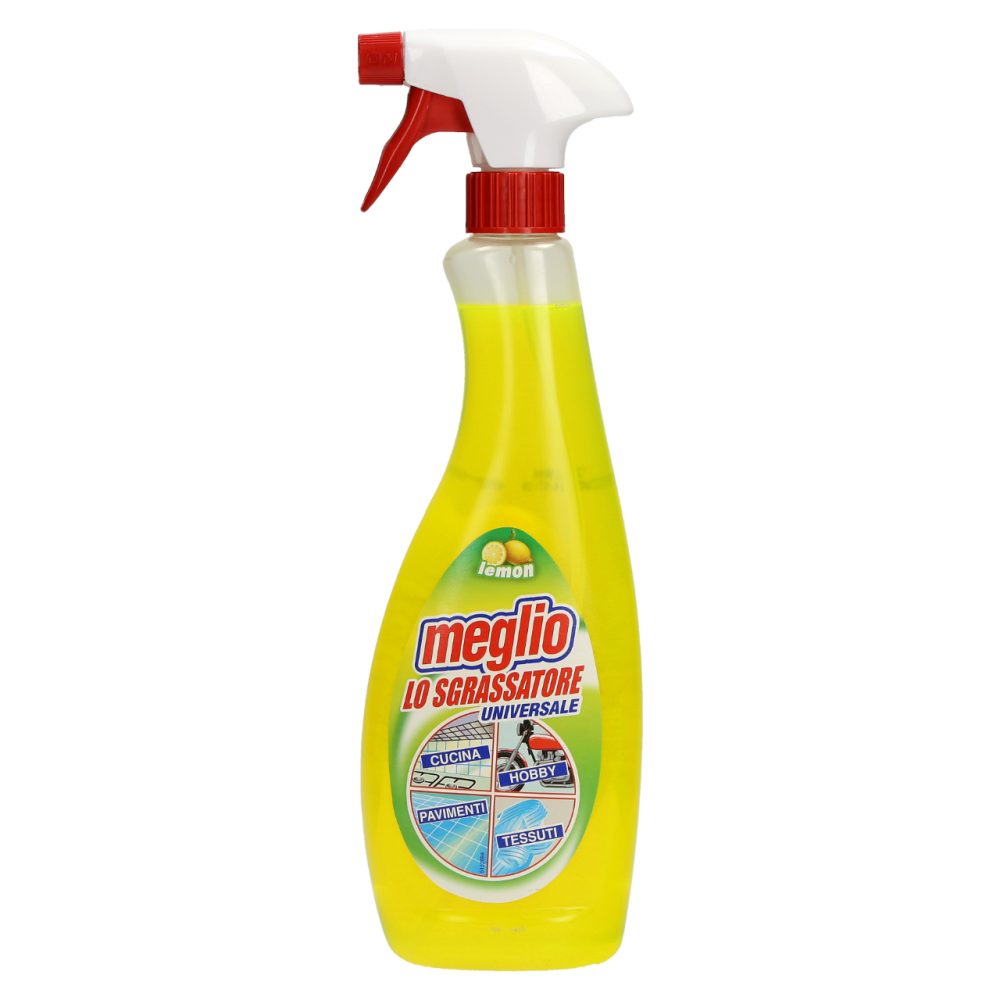 Univerzalno čistilo Meglio s pršilom, z visokim razmaščevalnim učinkom, idealno za čiščenje vseh pralnih površin. Za čiščenje pečic, gospodinjskih aparatov, kuhinjske nape in filtrov, žara, kamina, pomivalnih korit, madežev na oblekah, kolesa, avto-doma, čolna, avtomobilskega motorja, platišč, platnene strehe, ter vseh ostalih zamaščenih pralnih površin. Odlično univerzalno čistilo za razmaščevanje vseh površin, uporabno sredstvo pri čiščenju v vašem domu, vikendu ali v delavnici. Površino, ki jo želimo očistiti poškropimo in pustimo učinkovati nekaj sekund (oziroma do 4 minute za zelo zamazane površine), nato izperemo.
