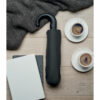 Dežnik s samodejnim odpiranjem/zapiranjem, odporen na veter, iz dvoslojnega 190T pongeeja s karirastim notranjim vzorcem. Črno prevlečen okvir in gred. Dvodelni srednji del iz črnih steklenih vlaken, ponikljan. Ukrivljen lesen ročaj.