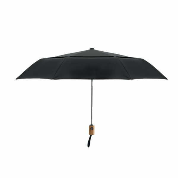 21-palčni dvodelni samodejni dežnik, odporen na veter, je izdelan iz polibombaža 190T (70 % poliester in 30 % bombaž) z aluminijasto gredjo, konicami in bambusovim ročajem. Črne stekleničaste rešetke. Vključuje ujemajočo se torbico. Samodejno zapiranje.