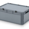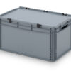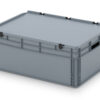 Evrozaboj s poklopnim pokrovom je mogoče zaradi preprostega poklopnega sistema v trenutku zapreti. Blago je odlično zaščiteno pred transportnimi poškodbami in umazanijo. Možnost skladanja tudi s pokrovom, usklajeno z evromerami, stabilni tečaji, z odprtimi ali zaprtimi držaji.