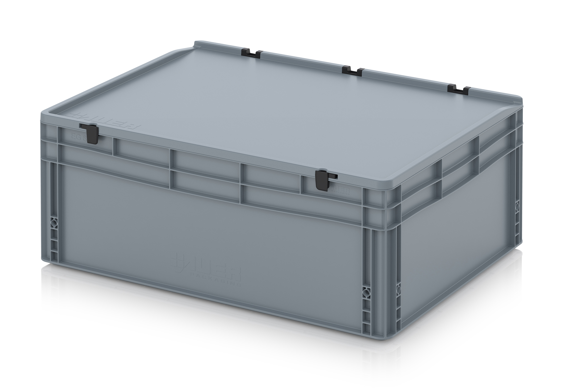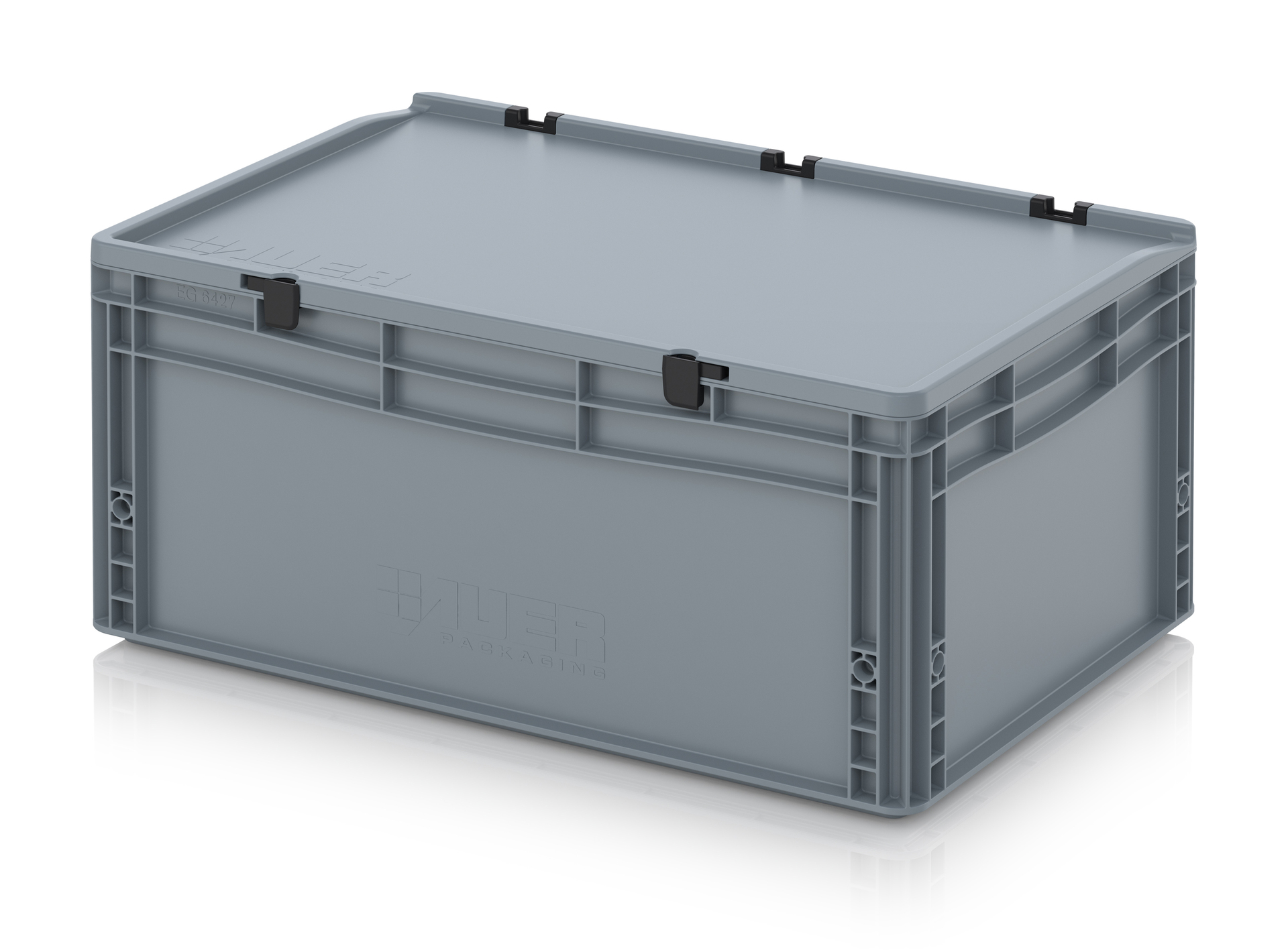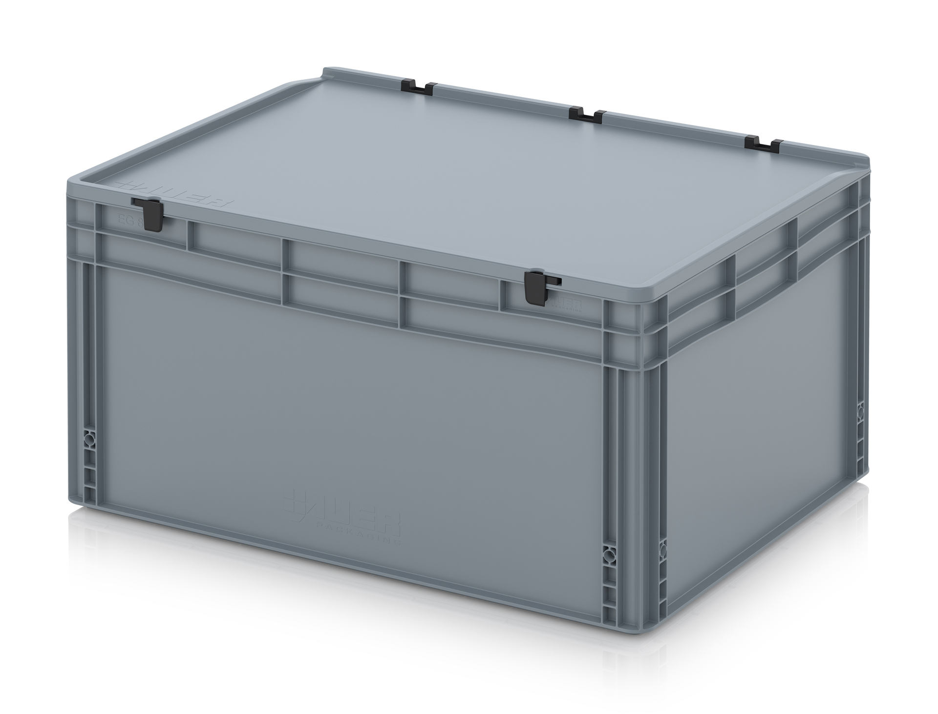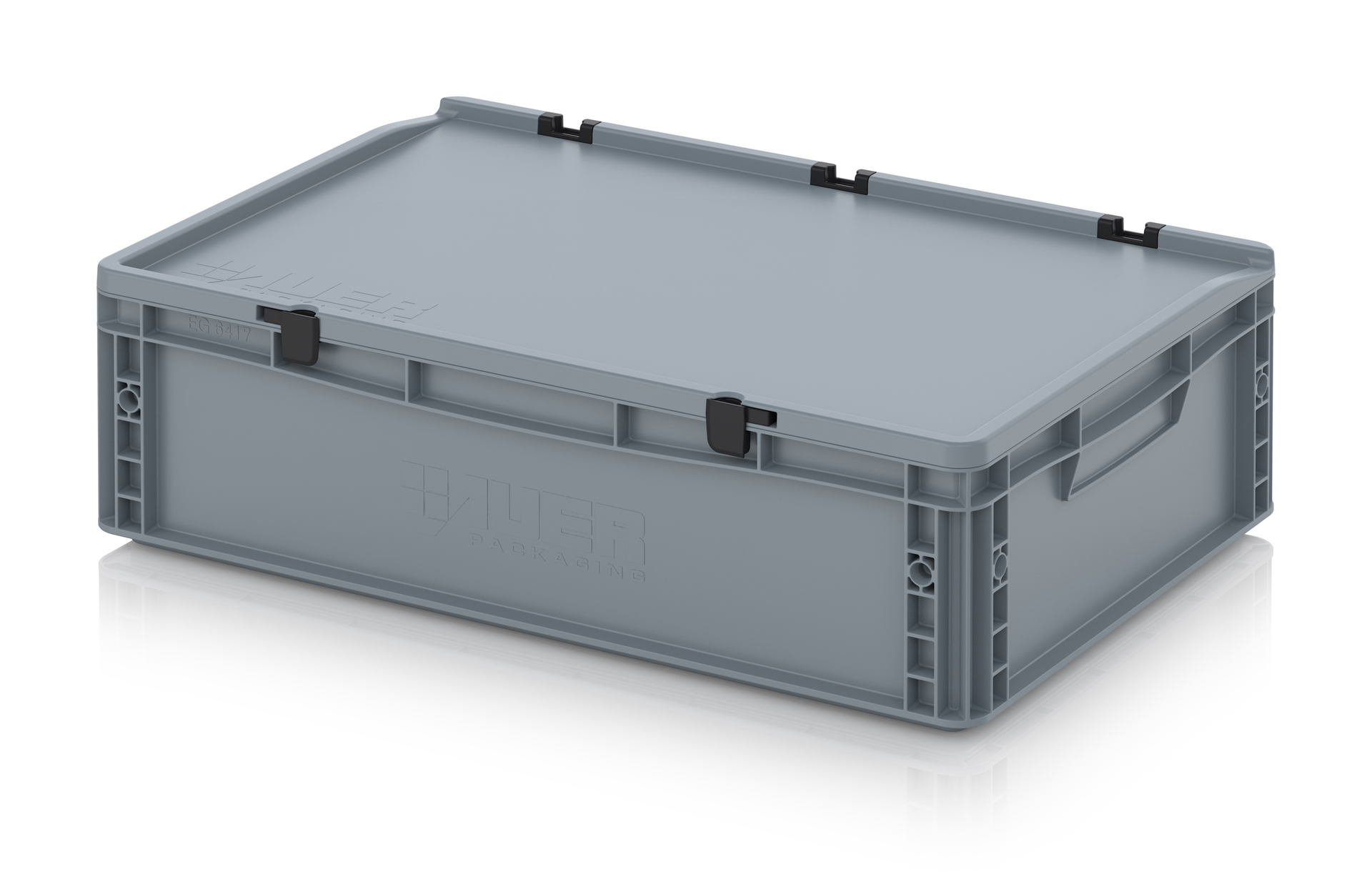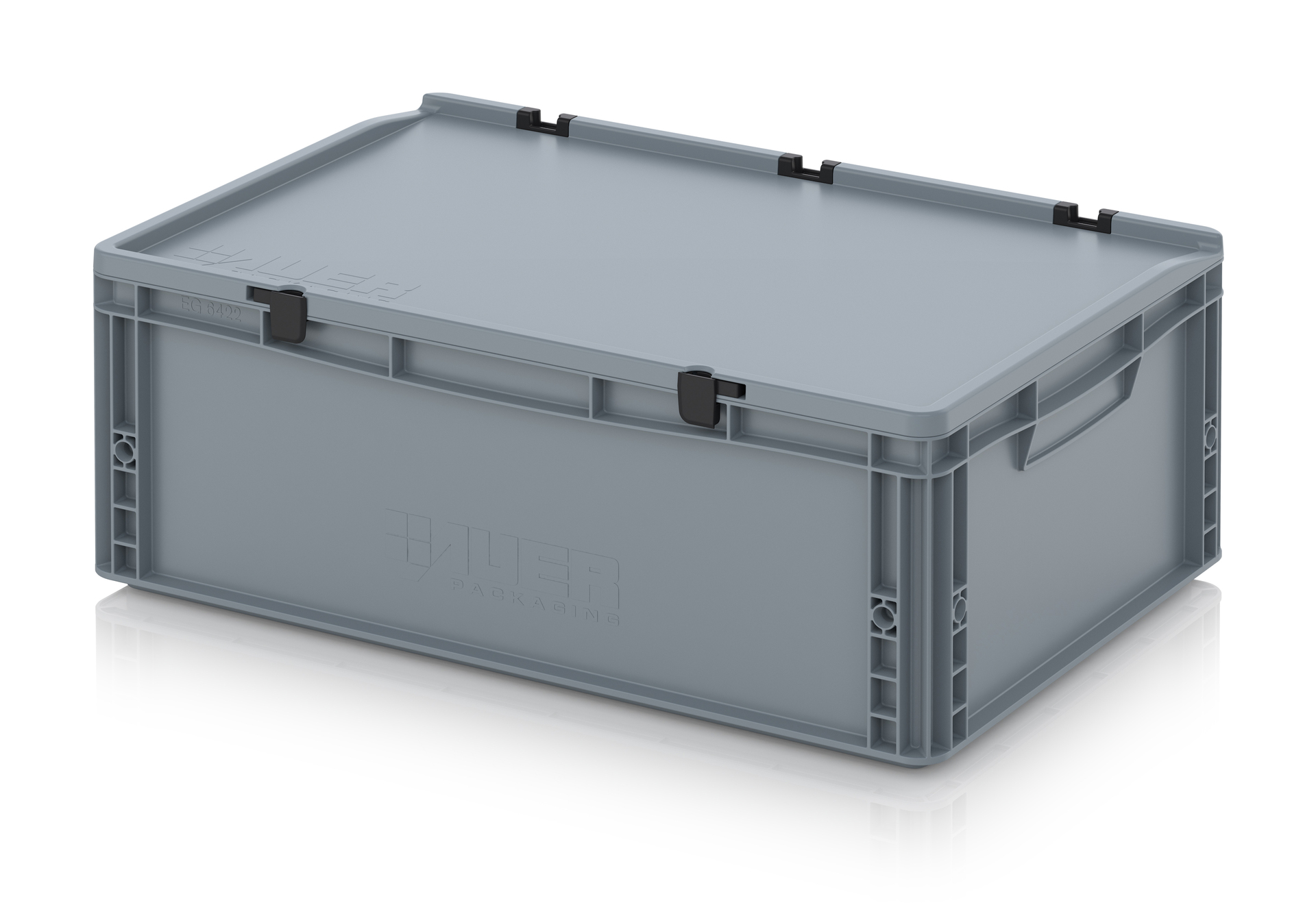 Evrozaboj s poklopnim pokrovom je mogoče zaradi preprostega poklopnega sistema v trenutku zapreti. Blago je odlično zaščiteno pred transportnimi poškodbami in umazanijo. Možnost skladanja tudi s pokrovom, usklajeno z evromerami, stabilni tečaji, z odprtimi ali zaprtimi držaji.