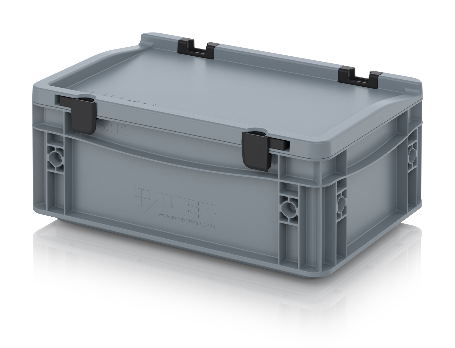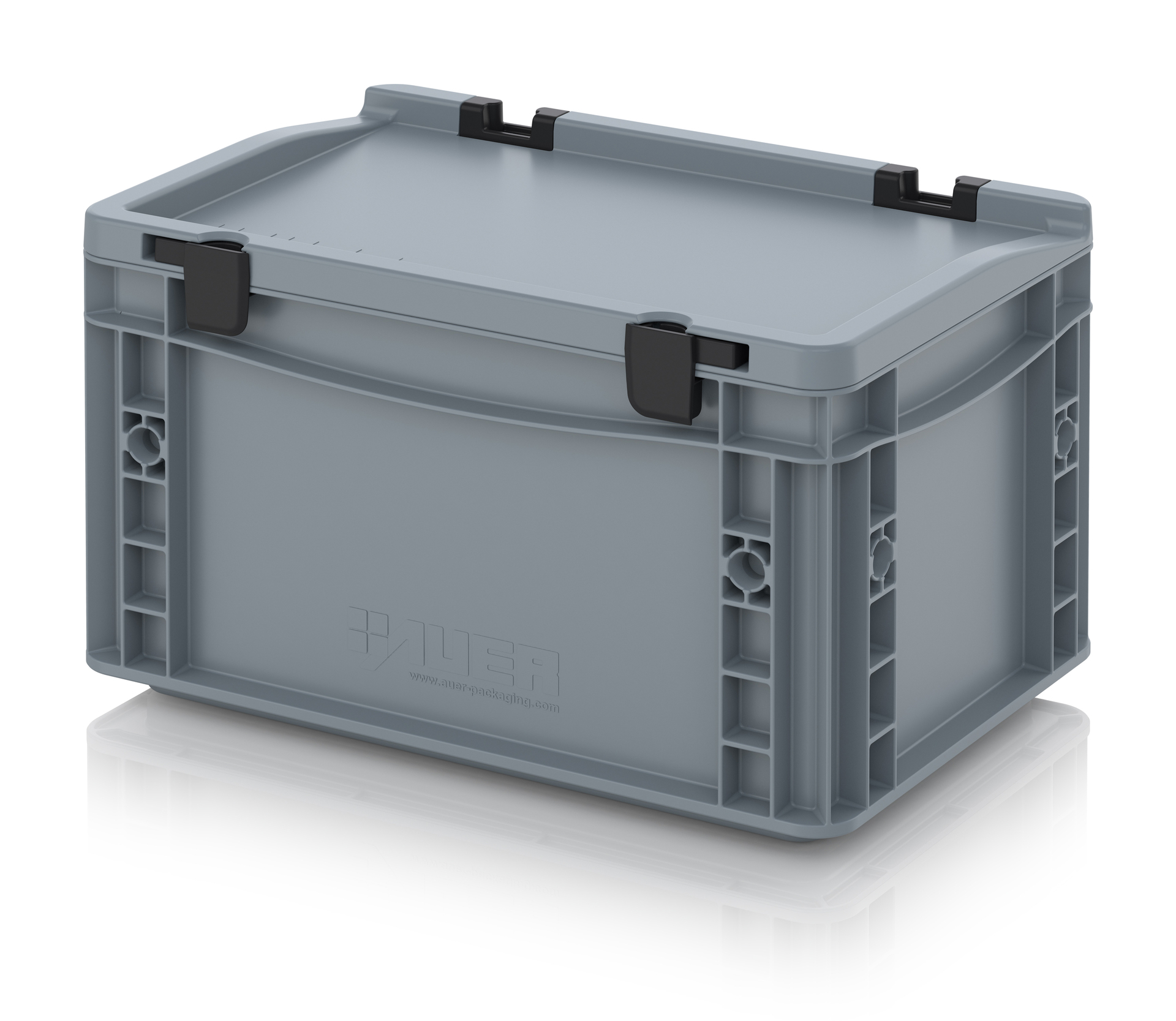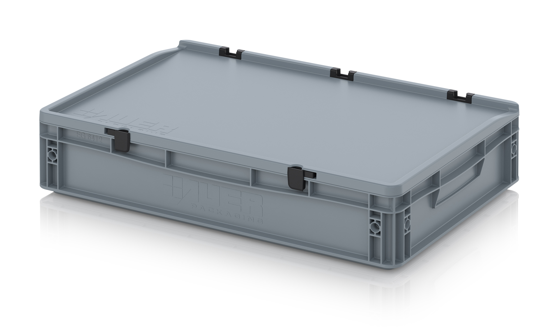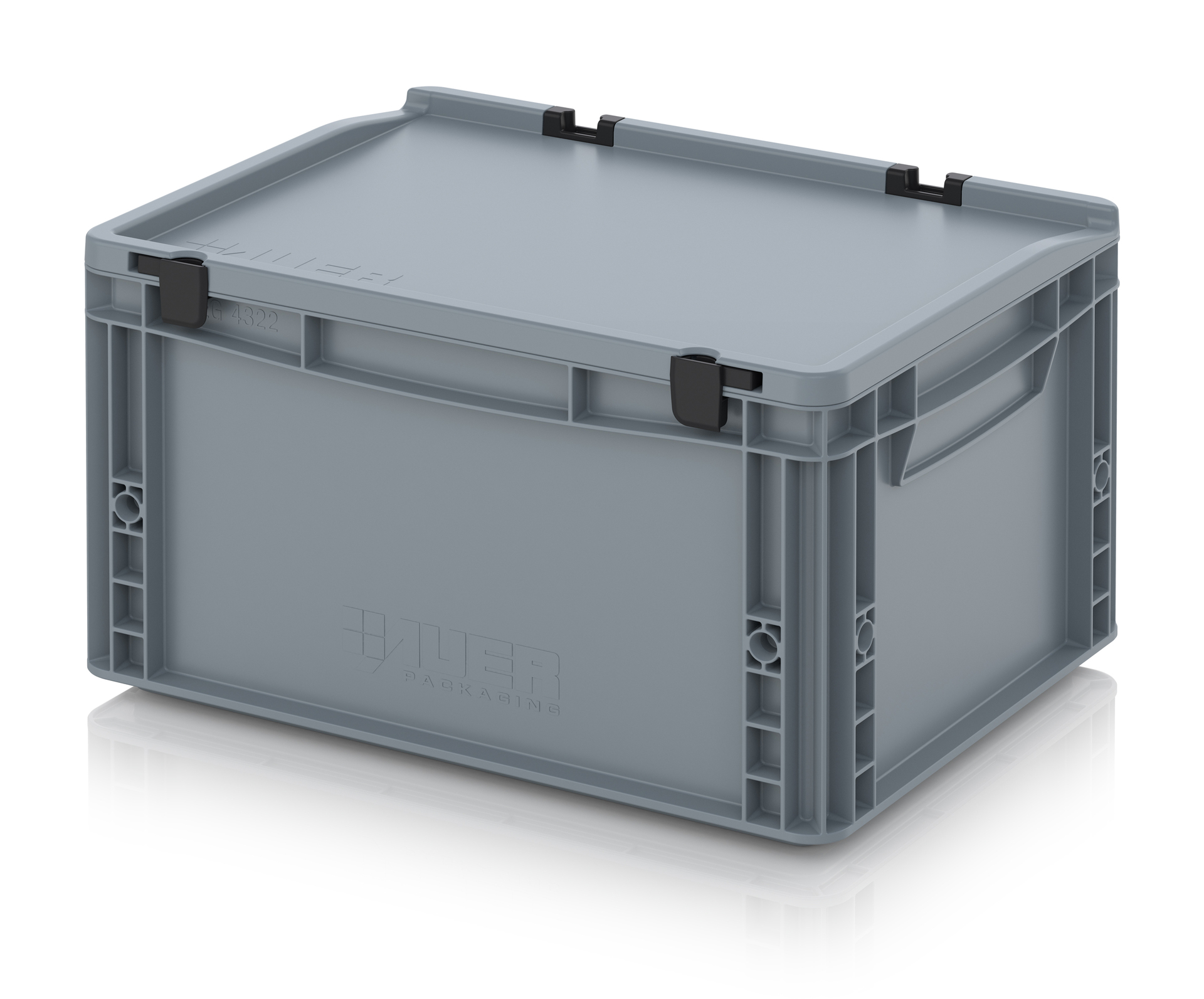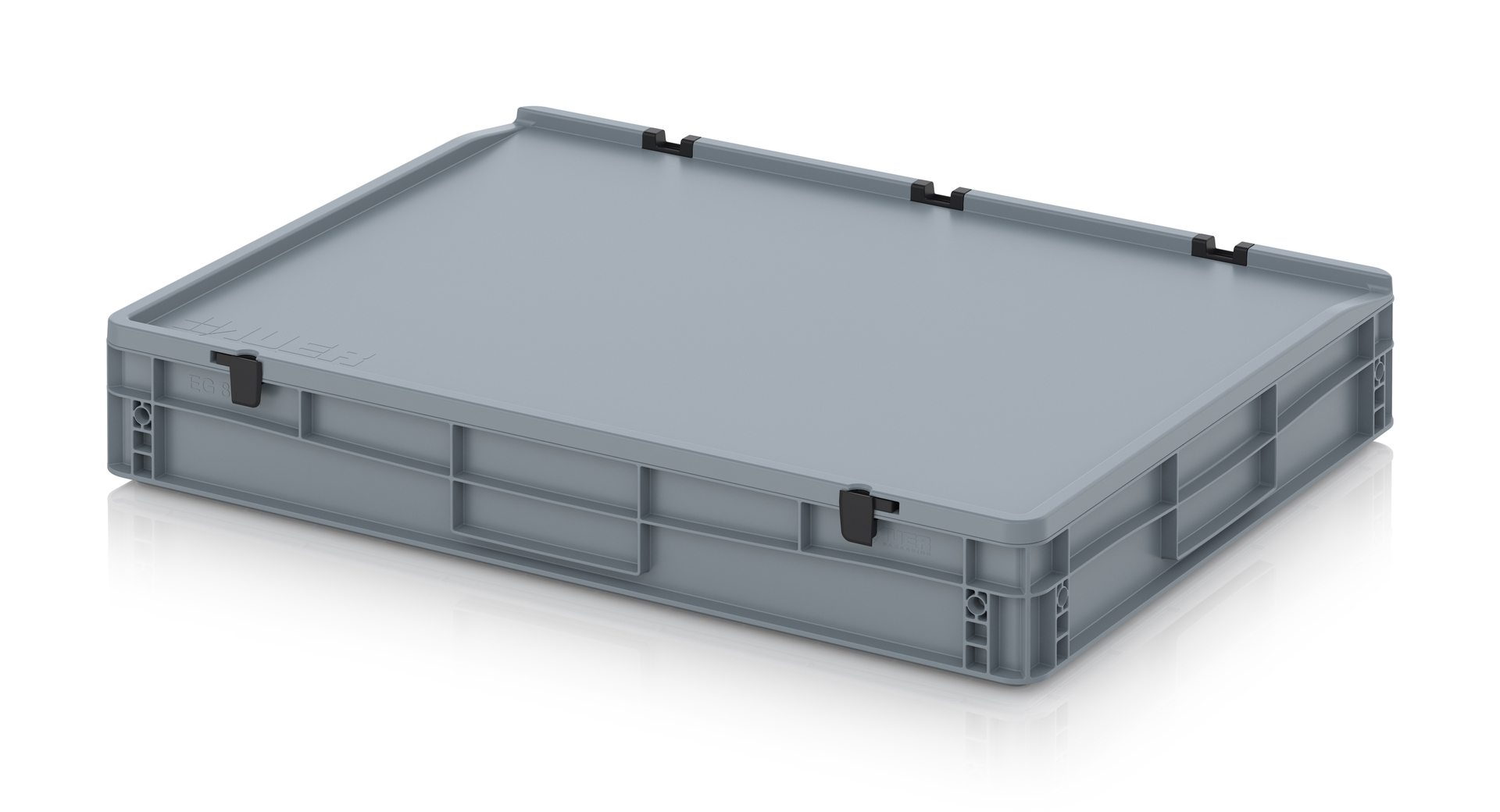Evrozaboj s poklopnim pokrovom je mogoče zaradi preprostega poklopnega sistema v trenutku zapreti. Blago je odlično zaščiteno pred transportnimi poškodbami in umazanijo. Možnost skladanja tudi s pokrovom, usklajeno z evromerami, stabilni tečaji, z odprtimi ali zaprtimi držaji.