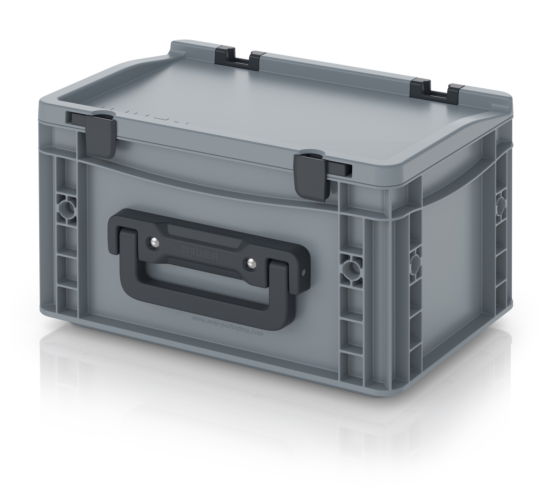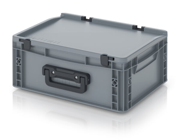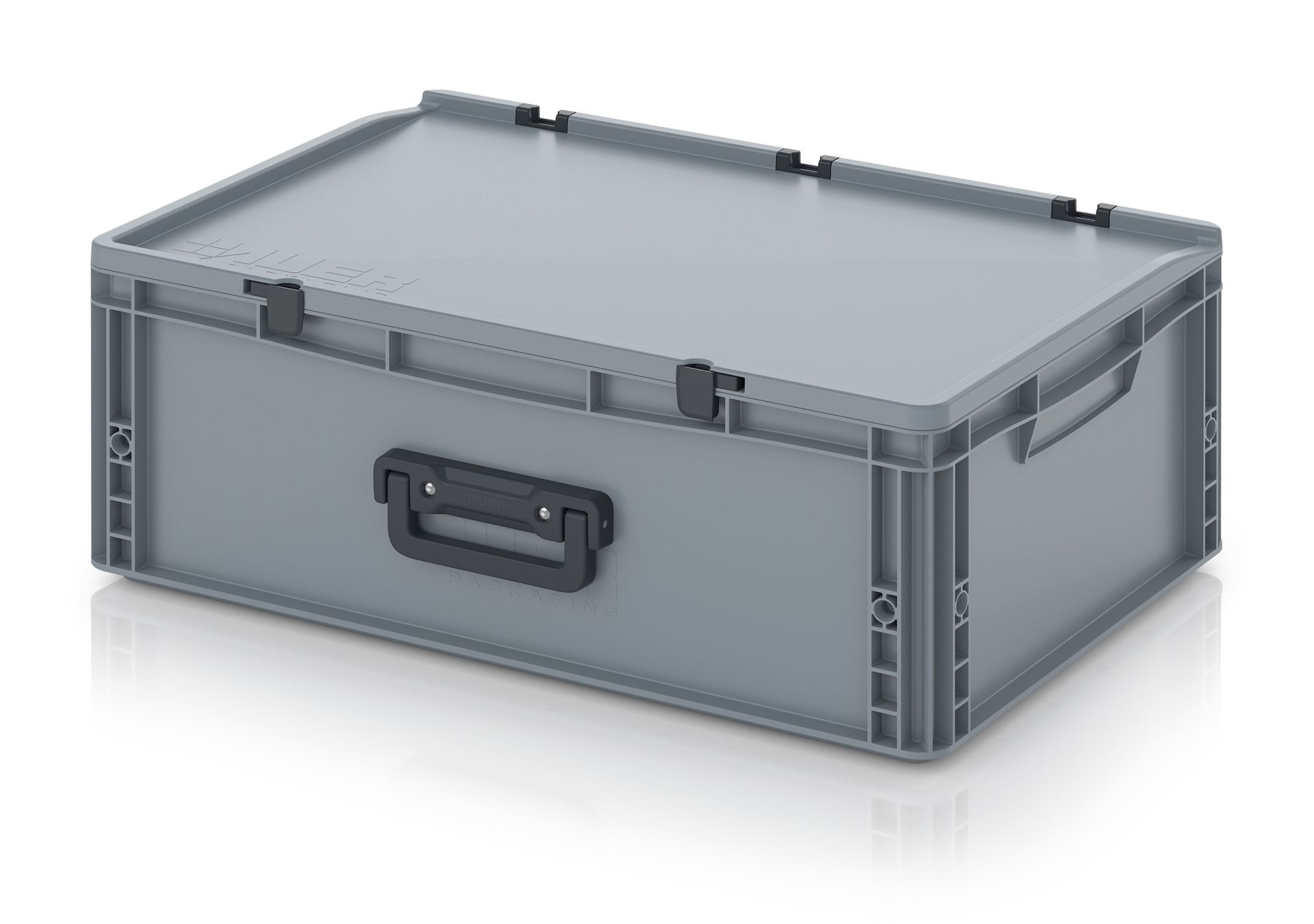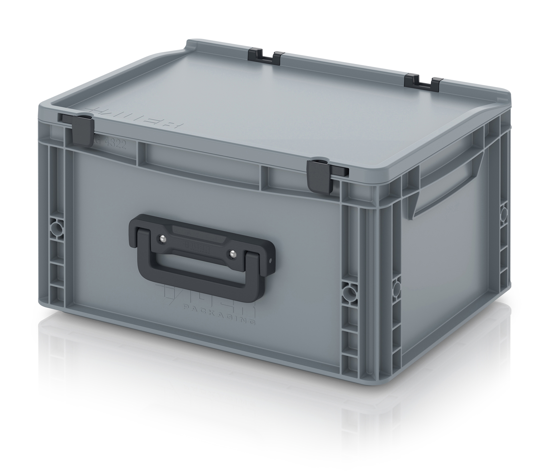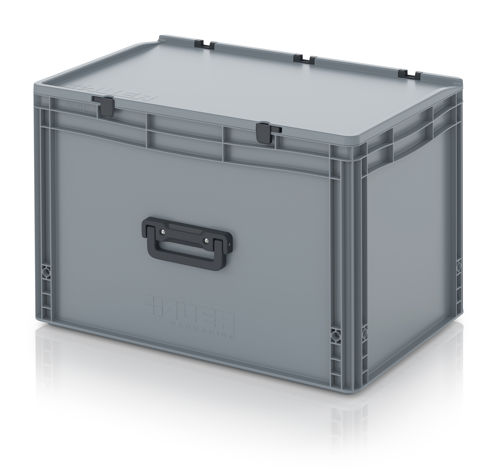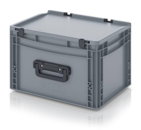 Evrozaboji v obliki kovčka s priročnimi ročaji omogočajo varno in udobno nošenje – tudi težje vsebine. Za zavarovanje vsebine je pokrov mogoče pritrditi z dvema tečajema in dvema zaskočnima zapiraloma. Možnost skladanja tudi s pokrovom, zaprte prijemalne odprtine, različni ročaji, posebej trpežno.