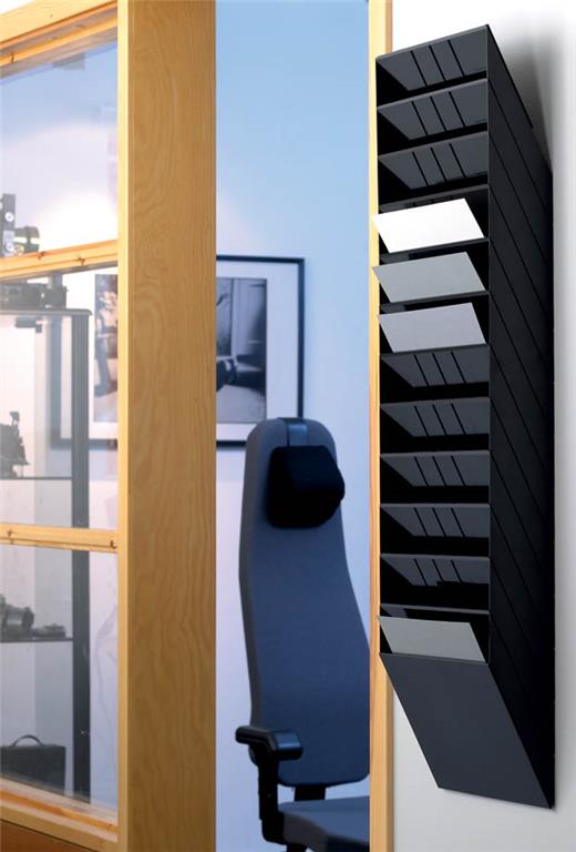 Robusten nosilec za prospekte primeren za vlaganje dokumentov, prospektov, brošur in drugega informacijskega gradiva namenjenega strankam, obiskovalcem in zaposlenim do formata A4 (240 x 311 mm) ležeče. Primerno je tudi kot organizacijski pripomoček v delavnicah in proizvodnji. Stojalo je primerno za montažo na steno in ima dvanajst predalov globine 24 mm za vlaganje gradiva formata A4 ležeče.