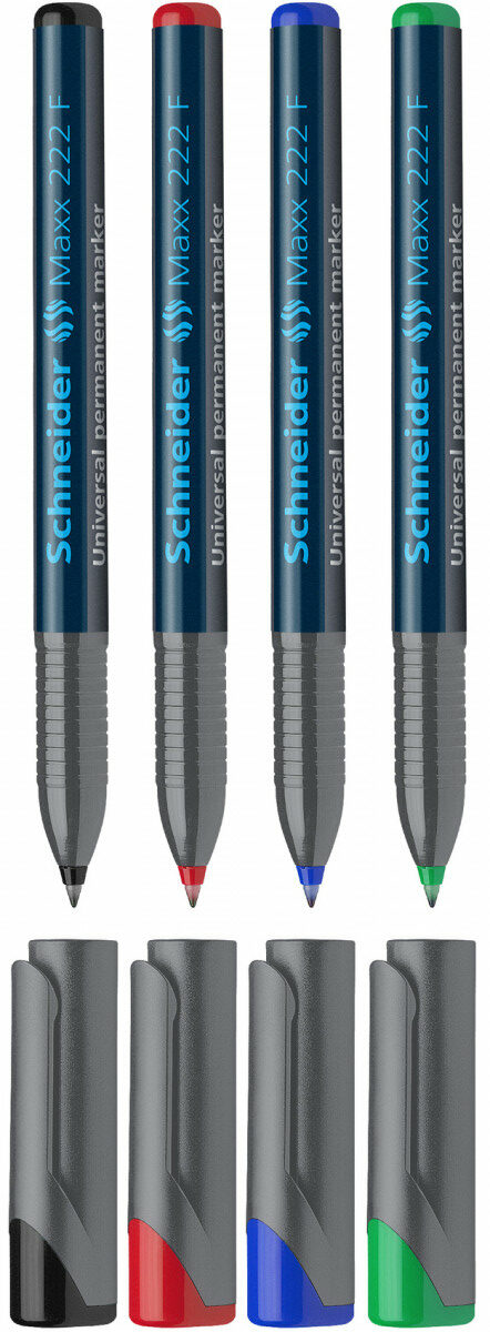 Univerzalni permanentni marker Schneider Maxx 222 F je vsestranski marker s fino konico. Širina črte je 0,7 mm in je odlična rešitev za pisanje na prosojnice (OHP), papir, plastiko, steklo, kovine in skoraj vse druge materiale. Črnilo je hitro sušeče, vodoodporno in gladko. Cap-off črnilo se na konici ne posuši, tudi če je pokrovček odstranjen 2-3 dni. Ima malo vonja in ne vsebuje toluola in xylola. Pisalo ima praktično žepno zaponko, lahko pa ga ponovno napolnite z uporabo polnila Maxx 645.