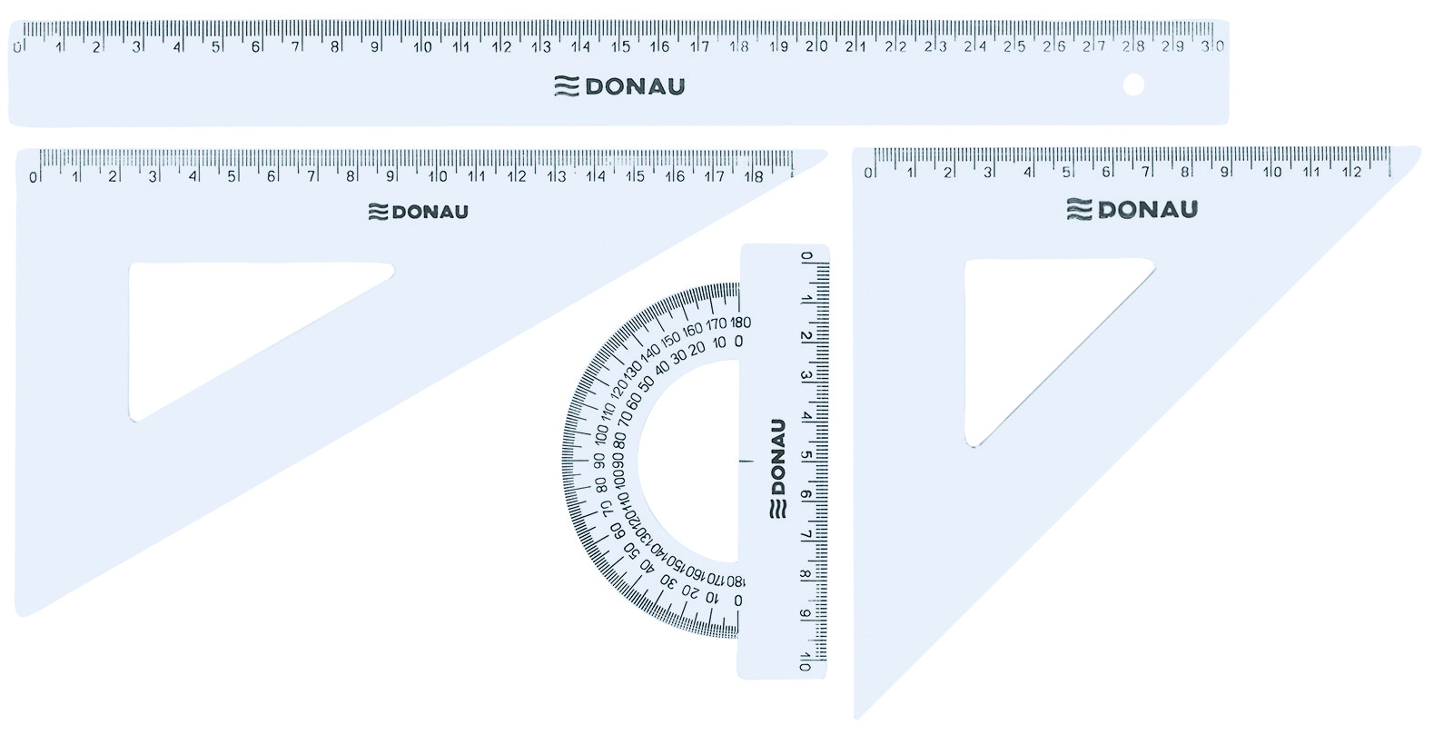 Cenovno ugoden geometrijski komplet ravnil iz plastike odporen na deformacije in lomljenje namenjen šolarjem. Komplet vsebuje dva trikotnika, ravnilo in kotomer.