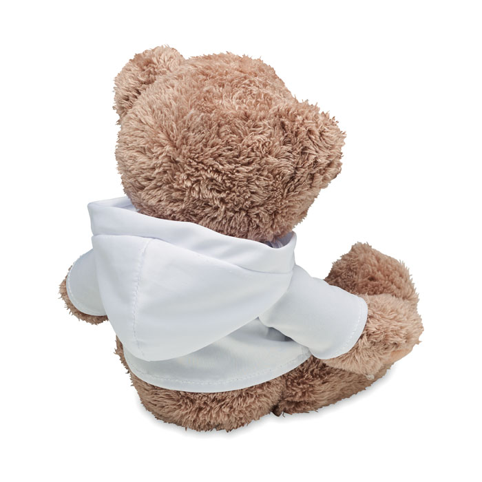 Medvedek veliki plišasti, oblečen v pulover s kapuco.