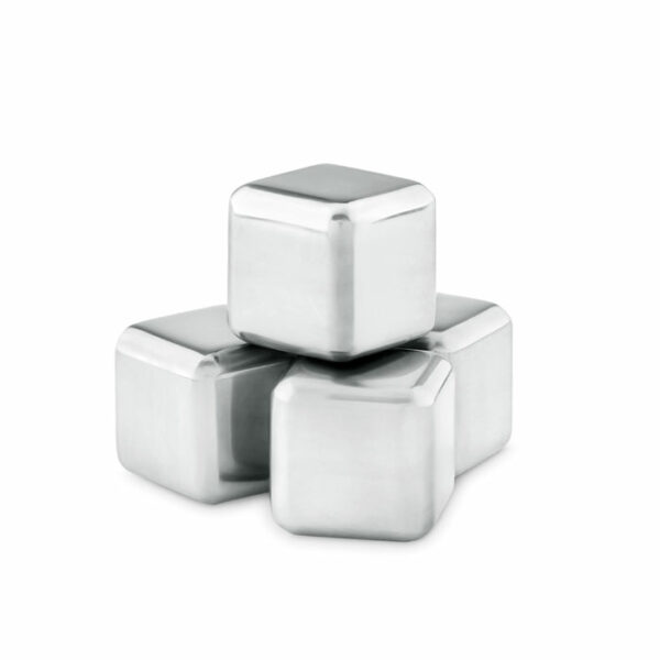 Set štirih ledenih kock iz nerjavečega jekla za večkratno uporabo, pakirano v žametni vrečki.
