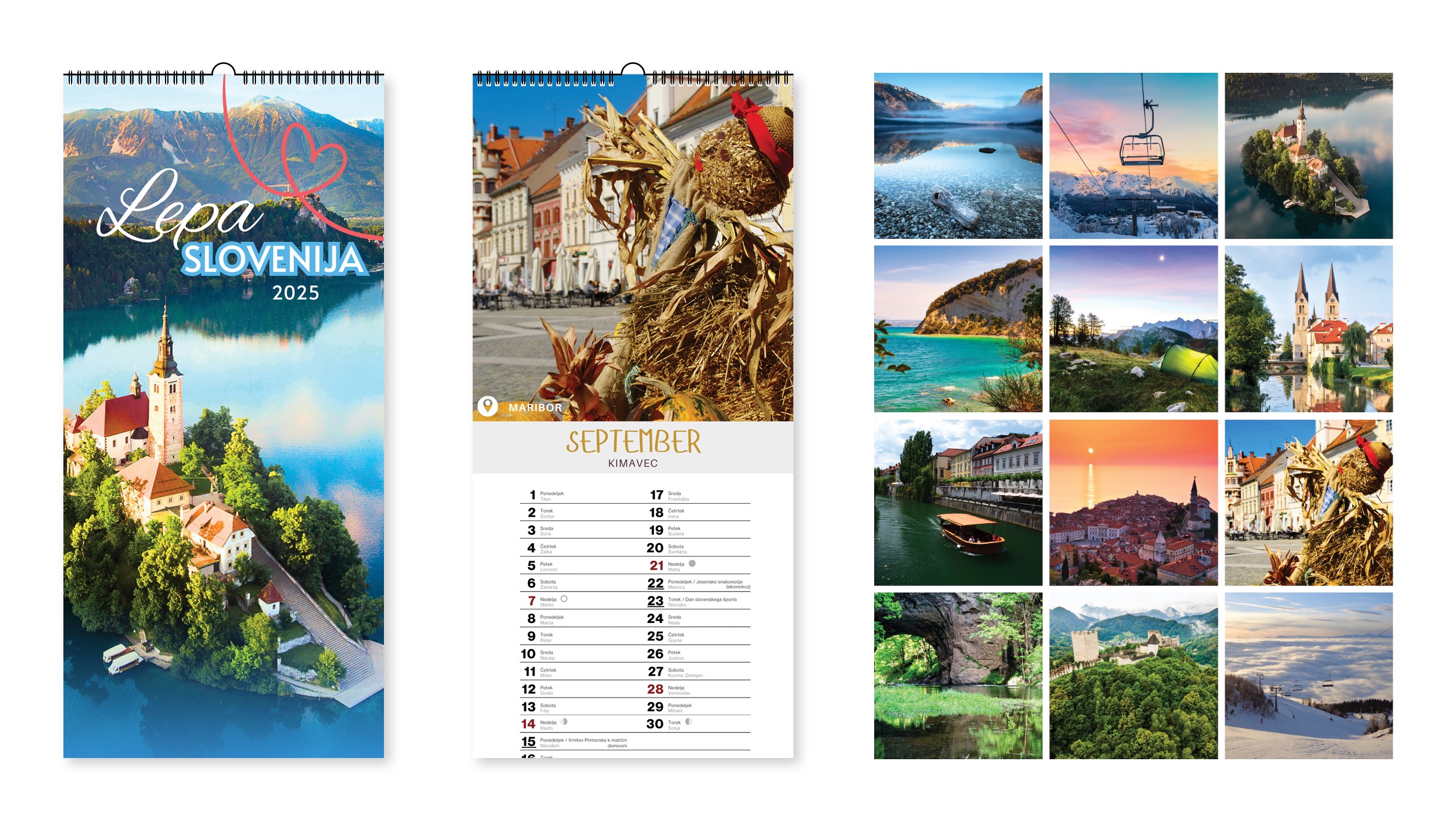 Stenski koledar Lepa Slovenija, označeni prazniki in lune.