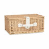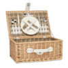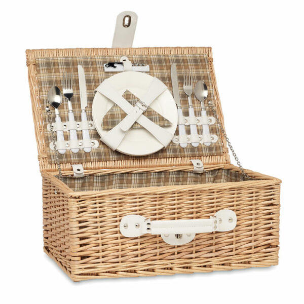 Komplet pletene piknik košare za 2 osebi. Priložen je 1 odpirač za steklenice, 2 žlici iz nerjavečega jekla, vilice in noži, 2 keramična krožnika, 2 kozarca in 2 bombažna prtička. Vse lepo pritrjeno na pokrov, tako da lahko celotno košaro napolnite z okusno hrano in pijačo