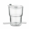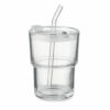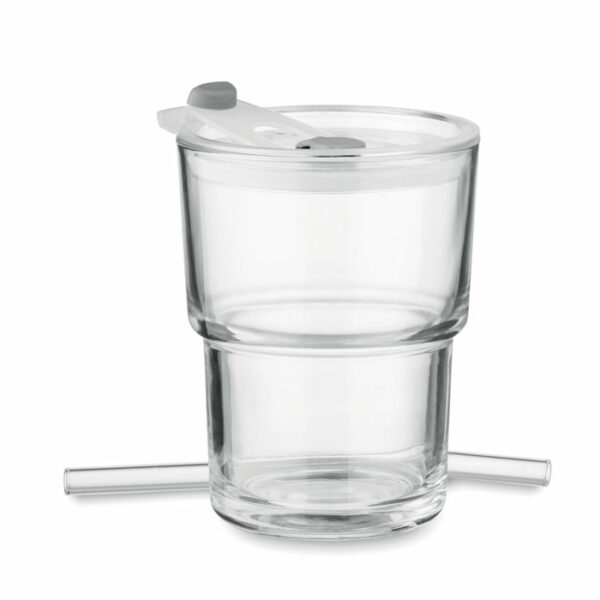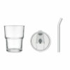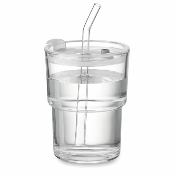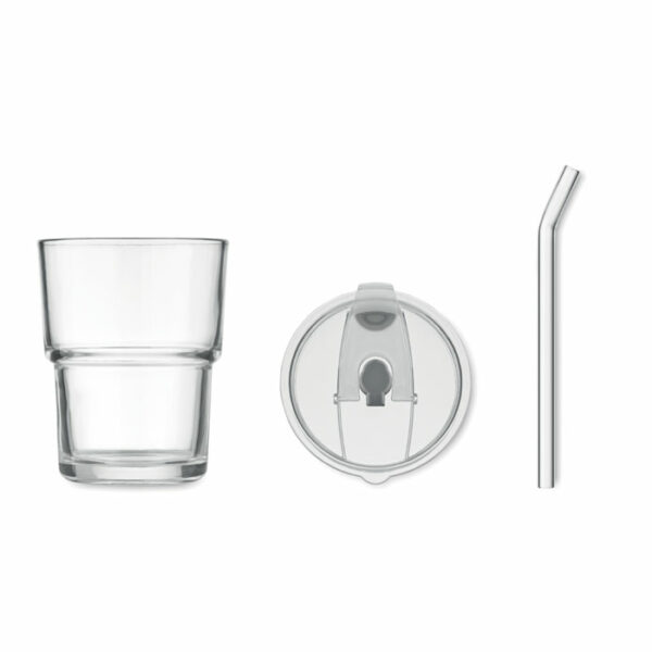 Kozarec stekleni s pokrovom, vključno s snemljivo stekleno slamico. Nastavek za slamico in neposreden pokrov za pijačo, ki ne pušča.