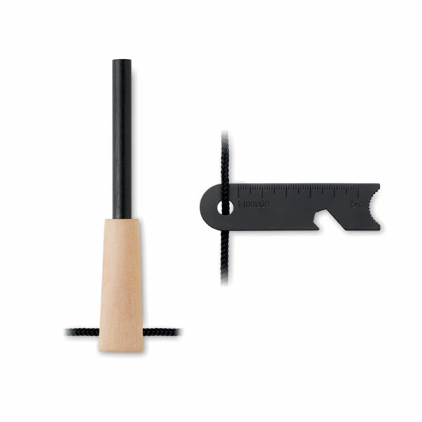 Orodje za zažiganje ognja iz borovega lesa in nerjavečega jekla, vključno s palico za prižiganje, večnamenskim strgalom, ki ga lahko uporabljate skupaj z zaganjalnikom, odpiračem za steklenice, natančnim ravnilom in šestrobnim ključem.