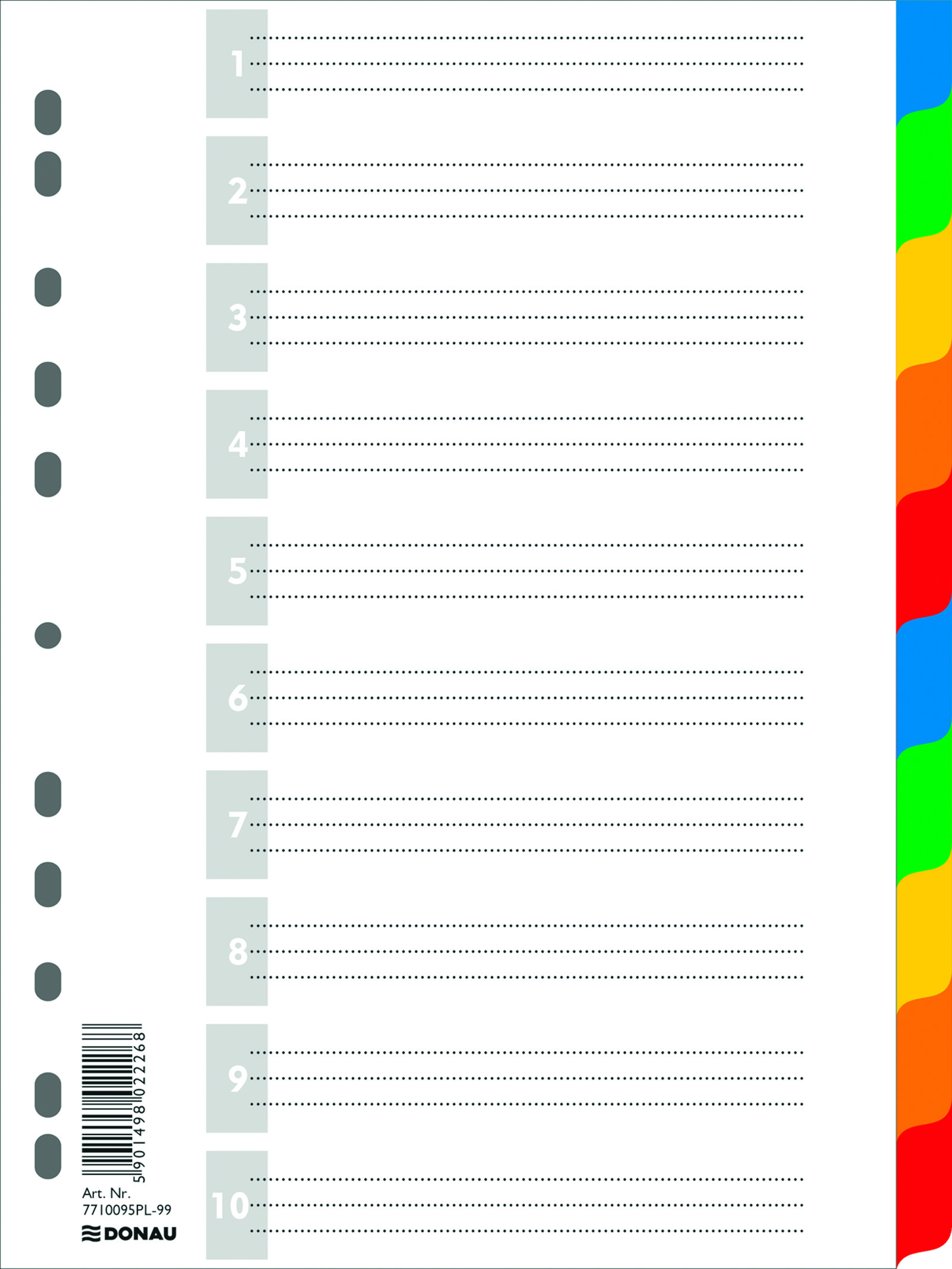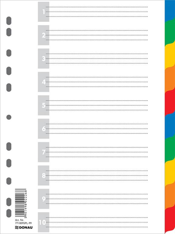 Pregradni karton za ločevanje dokumentov formata A4 izdelani iz 120mic polipropilenske folije. 10 delni barvni ločilni listi z naslovnico za vpis vsebine, ki omogoča pregledno shranjevanje dokumentov.