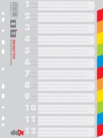 Pregradni karton za ločevanje dokumentov formata A4 izdelani iz 150mic polipropilenske folije. 20 delni barvni ločilni listi, z naslovnico za vpis vsebine, ki omogoča pregledno shranjevanje dokumentov.