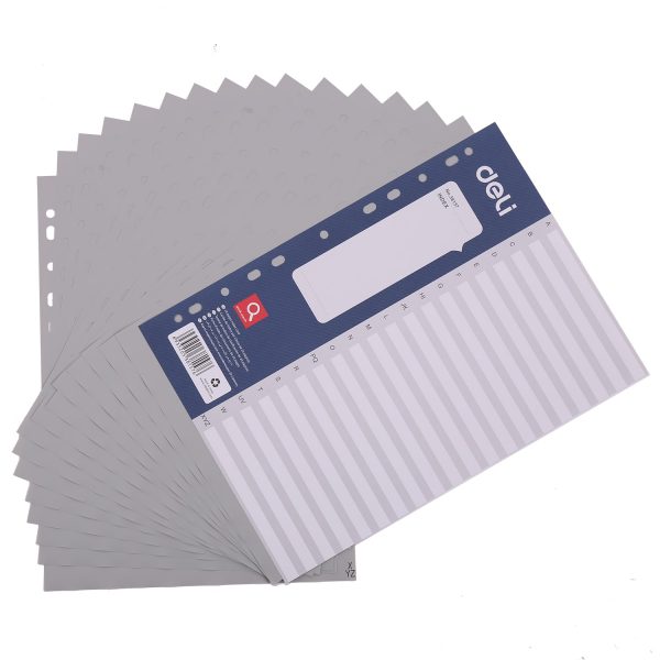 Pregradni karton za ločevanje dokumentov formata A4 izdelani iz kvalitetne polipropilenske folije. 20 delni (A-Z) sivi ločilni listi z naslovnico za vpis vsebine, ki omogoča pregledno shranjevanje dokumentov.