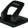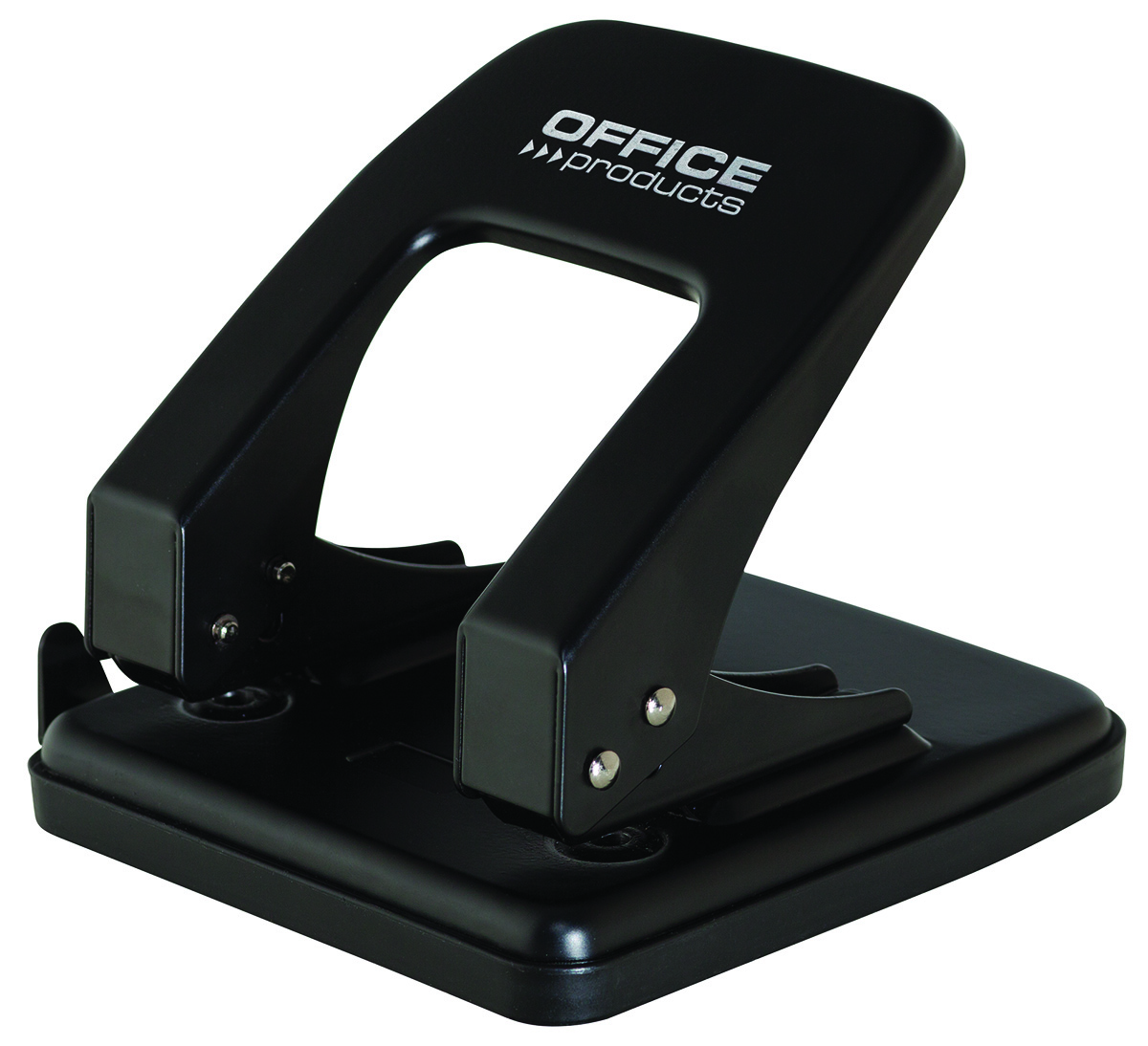 Pisarniški luknjač s kovinskim podstavkom in ročko iz trpežne plastične mase. Spodnji del luknjača je izdelan iz plastične mase, ki ščiti pohištvo pred poškodbami.