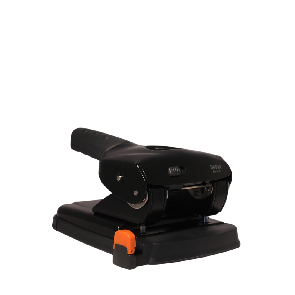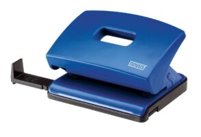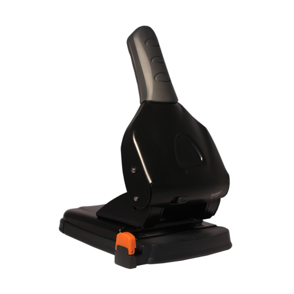 Pisarniški luknjač s kovinskim podstavkom in ročko iz trpežne plastične mase. Spodnji del luknjača je izdelan iz plastične mase, ki ščiti pohištvo pred poškodbami.