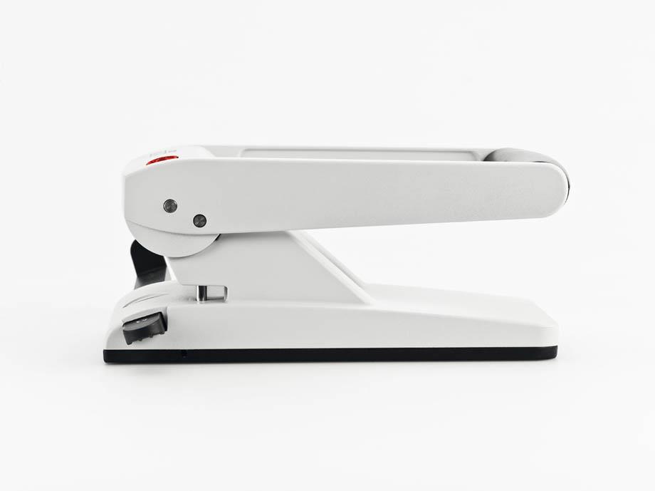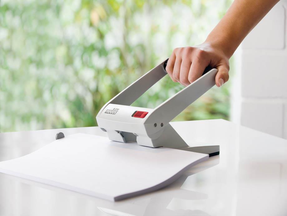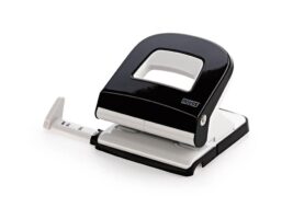 Močan in stabilen zmogljiv luknjač za papir v celoti izdelan iz kovine. Spodnji del luknjača je izdelan iz plastične mase, ki ščiti pohištvo pred poškodbami. Praktično zaklepanje ročke luknjača prihrani prostor za shranjevanje.