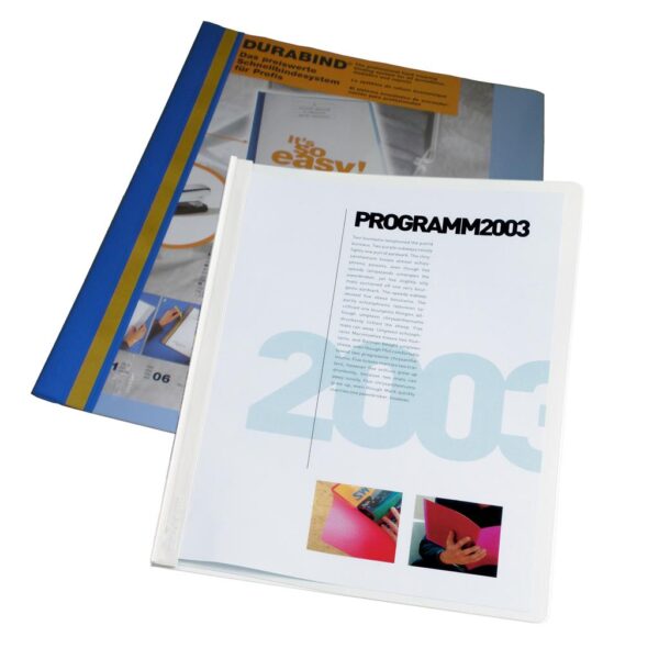 Z mapo Durabind (2250) boste hitro in profesionalno speli do 30 listov. Sprednja platnica je prozorna, zadnja pa barvna. Spenjanje poteka v naslednjih korakih (vstavite dokument in ga spnete na štirih označenih mestih, odstranite zaščitni trak s samolepilne površine, sprednjo platnico zapognete čez samolepilno površino, postopek ponovite še za zadnjo platnico in spenjanje je končano).