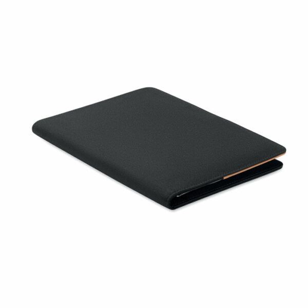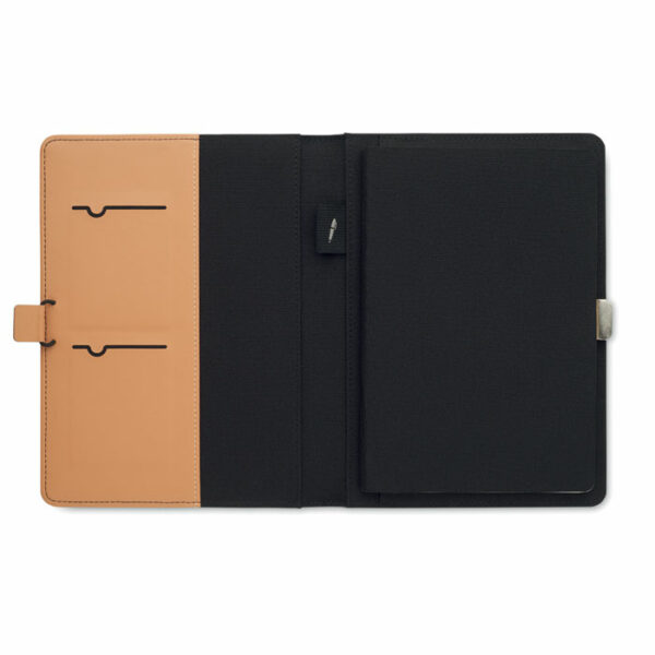 Konferenčna mapa A5 iz RPET z detajli iz umetnega usnja z zamenljivim blokom A5 s trdimi plutastimi platnicami. 128 črtanih strani iz recikliranega papirja (64 listov), držalo za pisalo, dva držala za kartice in en velik predal. Elastičen trak za zapiranje s kovinskim detajlom.