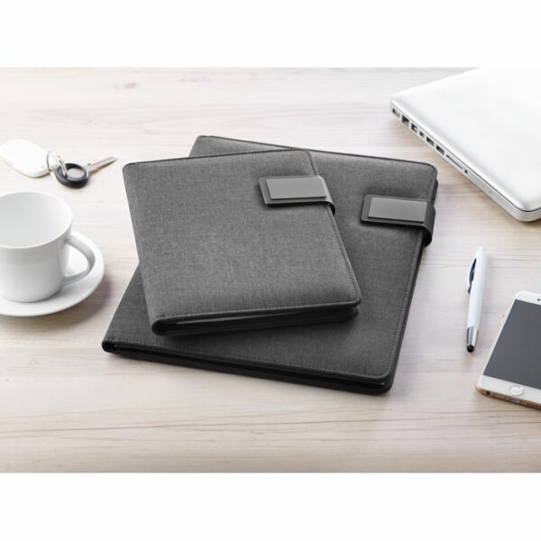 Konferenčna mapa A4 z laneno PU platnico. Powerbank 4000 mAh. Vgrajen mikro USB na priključek tipa C. Beležnica z 20 črtami. Več notranjih predelkov. Magnetno zapiranje. Elastično držalo za pisala.