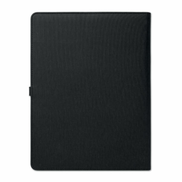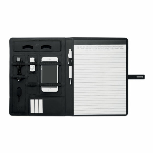 Konferenčna mapa A4 iz lanene poliuretanske tkanine z zapiranjem na zaponko. Brezžično polnjenje DC5V/1A. Napajalnik 4000 mAh z mikro USB priključkom tipa C. 20 črtastih listov notpad. Nosilec kartice. Držalo za pisalo. Črna aluminijasta plošča idealna za vaš logotip.