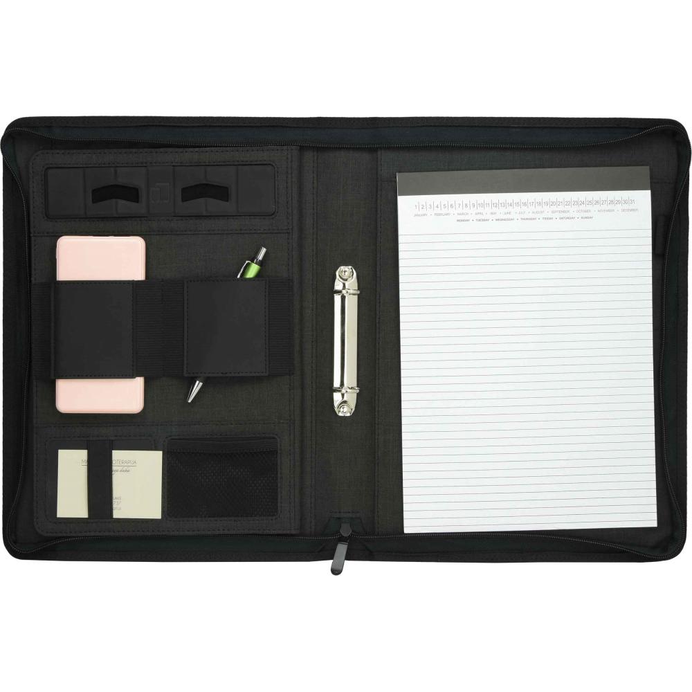 Poslovna mapa za dokumente formata A4 z ročajem, zadrgo in rinčnim mehanizmom za vpenjanje dokumentov. Mapa je v melange črnem tekstilu. V mapo je vložen 20 listni papirni blok, kalkulator in vgrajen dvo rinčni mehanizem. Na sprednji strani je okrasen PU všivni trak, primeren za toplotni tisk, ter elastično zanko za kemični svinčnik.