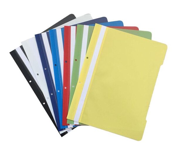 Plastična mapa za vpenjanje dokumentov formata A4 s hitrovezno sponko. Prednja platnica je iz prozorne polipropilenske folije, zadnja iz močne barvne polipropilenske folije. Ob strani navarjen žepek z izmenljivim listkom za vpis vsebine, dvakrat preluknjan za vstavljanje v registratorje.