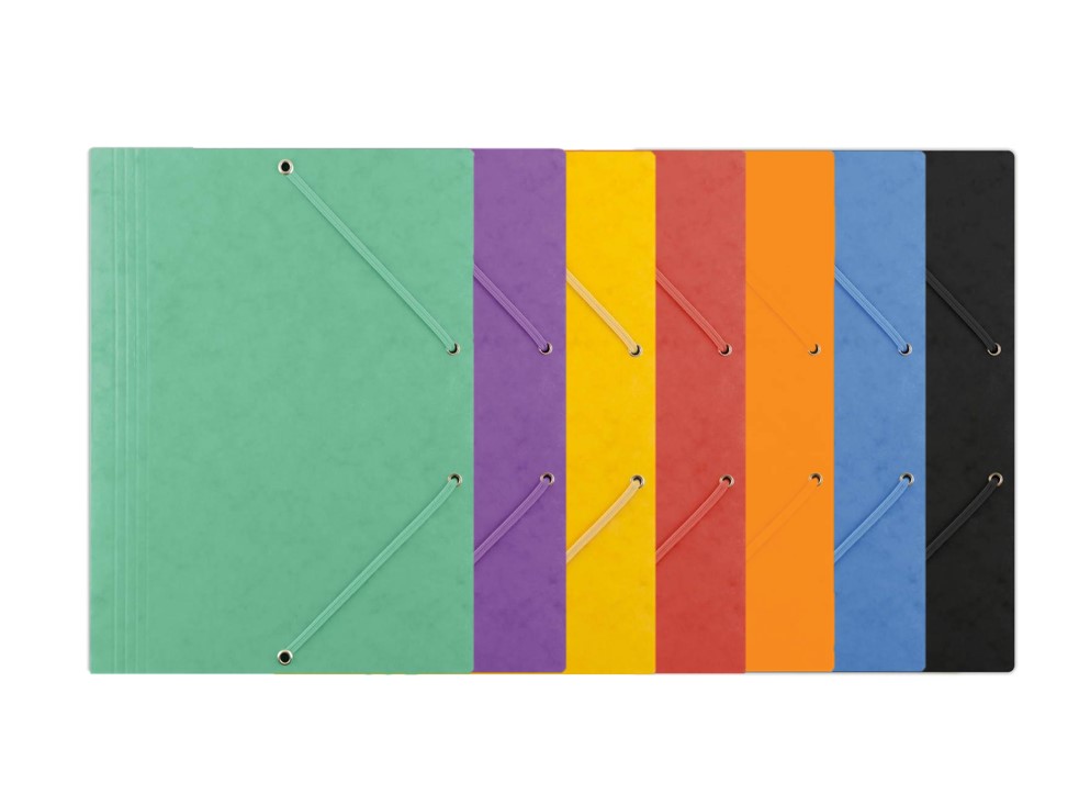 Barvna plastična preklopna mapa s tremi zavihki za vlaganje dokumentov in drugega gradiva brez luknjanja. Izdelana iz povoščenega prešpan kartona. Vložimo lahko do 220 listov 80g papirja. Elastika na vogalih preprečuje, da bi gradivo izpadlo iz mape. Dimenzije mape so 235 x 319 mm in je primerna za vlaganje gradiva do povečanega formata A4.