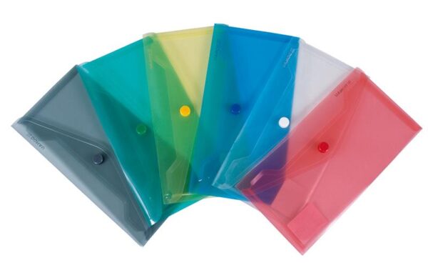 Trša prozorna mapa iz obstojne 0,18 mm debele okolju prijazne PP folije, za shranjevanje dokumentov formata 220x110mm. Mapa ima gumb za zapiranje/odpiranje na daljši stranici.