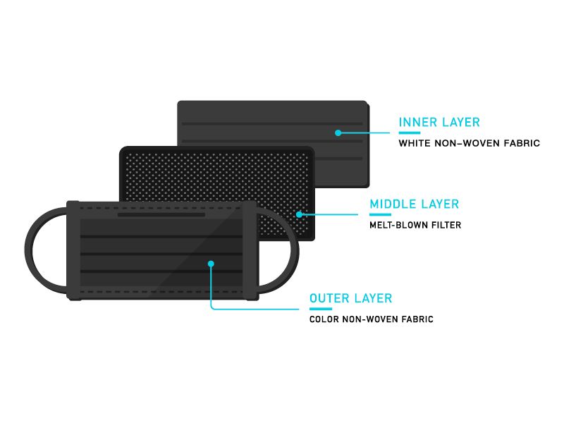 Maska je ne sterilen izdelek, za enkratno uporabo, dobro se prilega različnim oblikam obraza ter pokriva nos, usta in brado; nosna zaponka/žička je učinkovita, ustrezno velika in voljna za oblikovanje, material je mehak – nežen, koži prijazen, ne povzroča alergijskih reakcij, srbenja, ne pušča delcev. Oblika maske po namestitvi in dihanju ostane nespremenjene oblike – se ne prilepi na usta, zagotavlja čim manjši prost prehoda zraka ob straneh, ne otežuje oziroma ovira dihanja. Maska se pritrdi z elastiko, ki je mehka in ne tišči.