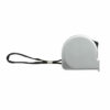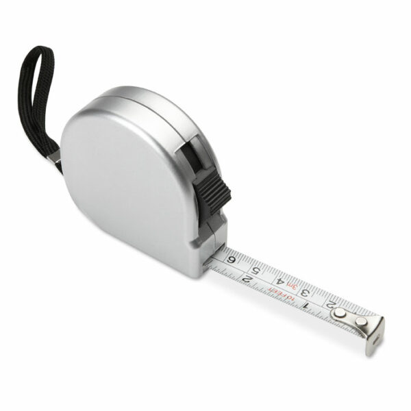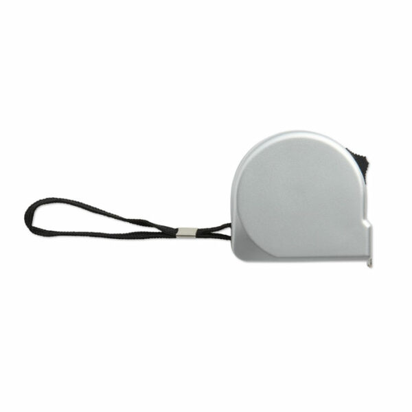 Meter tračni v mat srebrnem ohišju, vključuje pašček za roko in sijočo srebrno kovinsko sponko.