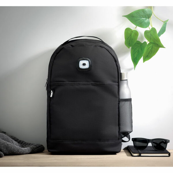 Nahrbtnik s snemljivo lučko COB na sprednji strani. Lučka COB v beli barvi s 3 različnimi nastavitvami svetilnosti. Sprednji žep z zapiranjem na kavelj in zanko. Mrežasti žep ob strani. Priložena gumbasta baterija.