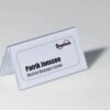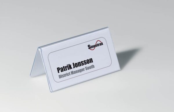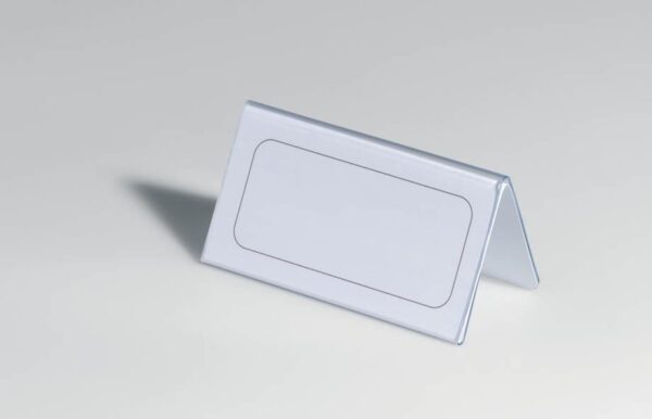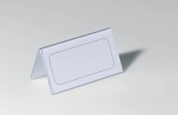 Praktične namizne imenske ploščice izdelane iz trde kristalno prosojne PVC folije. Napis je lahko viden na obeh straneh. Primerne so za konference, seminarje, recepcije in blagajne ali pa za označevanje izdelkov v izložbah, na sejmih ipd. V ploščice lahko vložimo prepognjene listke dimenzij 104 x 100 mm. Za lažje oblikovanje in tisk vložnih listkov lahko uporabite predloge na spodnji povezavi: https://www.durable-uk.com/services/duraprintreg-badge-making-software.html