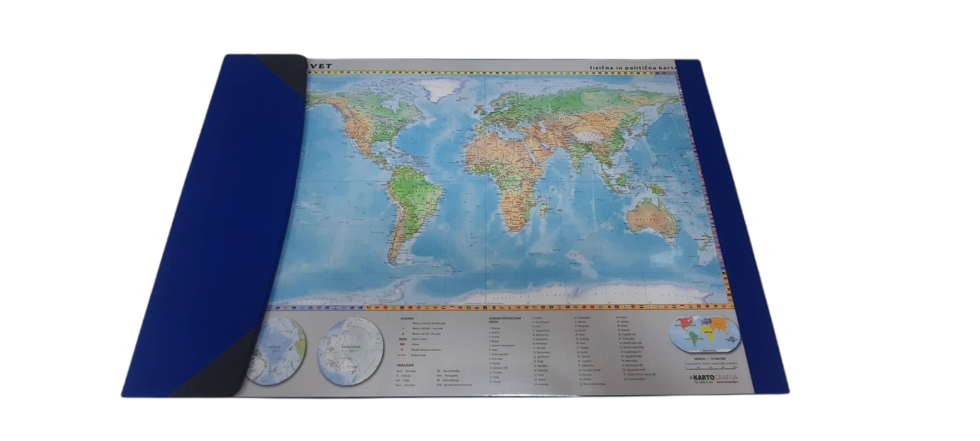 Namizna podloga z motivom sveta za pisalno mizo je uporabna tako na delovnem mestu kot tudi v domačem okolju. Podloga je narejena iz PVC materiala, na levi strani so priloženi trije bloki a6 za zapiske.