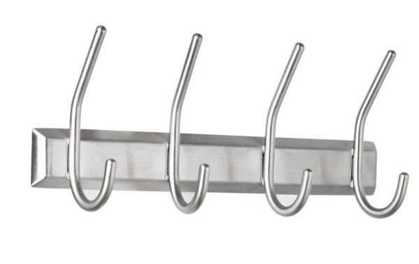 Stenski kovinski obešalnik za odlaganje oblačil. Izdelan je iz kvalitetnega srebrno matiranega nerjavečega jekla. Ima štiri obešalnike. Material za pritrditev na steno je priložen.