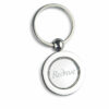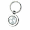 Kovinski obesek za ključe z dekoracijo globusa v notranjosti, pakiran v elegantni darilni škatli.