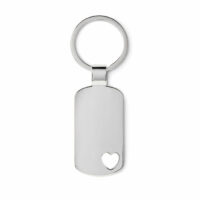 Kovinski pravokotni obesek za ključe, pakiran v elegantni darilni škatli.