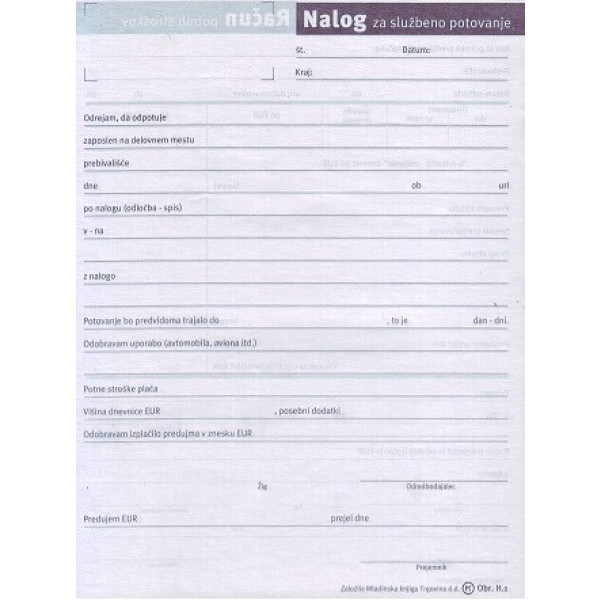 OBR. H.1 NALOG ZA SLUŽBENO POTOVANJE IN OBRAČUN