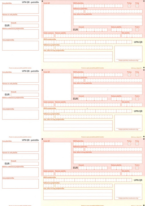 Obrazec UPN QR je namenjen za ročno in strojno izpolnitev podatkov. Izpolnimo ga v odvisnosti od namena. Tiskanje besedila na hrbtni strani obrazca UPN QR ni dovoljeno.