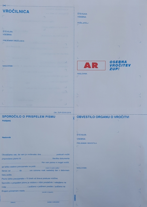 Kuverta za osebno vročanje priporočenih pisem po ZUP z vročilnico in sporočilom. Kuverta je primerna za izpis z laserskim tiskanikom. Vrečka za vlaganje sporočil je v formatu A5 (prepognjen list A4).