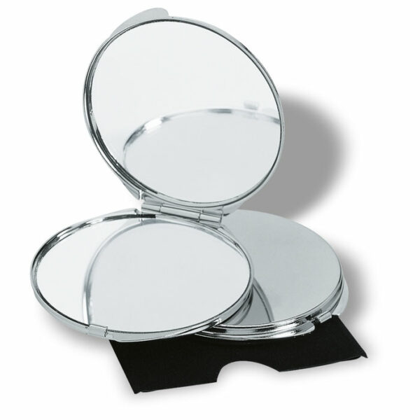 Kovinsko kozmetično ogledalo s standardnim in povečevalnim ogledalcem v žametni vrečki.