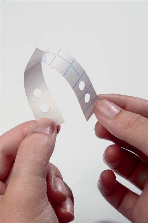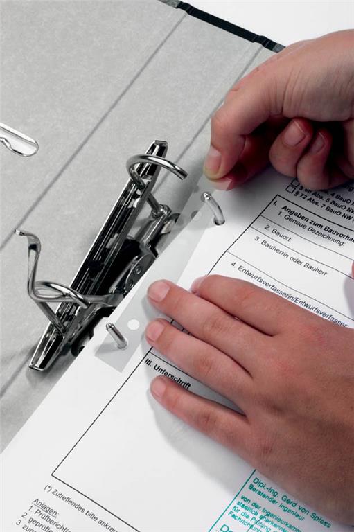 Samolepilni ojačitveni trakovi iz trpežne folija za ojačitev ali popravilo strganih lukenj na listih, ki so vpeti v registrator ali mapo. Za dokumente s standardno razdaljo luknjanja 60 ali 80 mm.