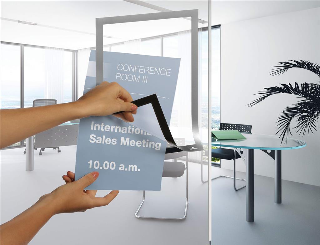 Praktični samolepilni magnetni okvirji za enostavno vstavljanje letakov, obvestil, slik, varnostnih informacij in opozoril. Samolepilno hrbtišče okvirja deluje po sistemu prilepi odlepi in ga lahko prilepite na kakršnokoli gladko in trdno površino ter ga po potrebi tudi prestavite, ne da bi pri tem ostali madeži na površini. Trpežna prozorna PVC folija varuje vložen dokument pred zunanjimi vplivi. Ker je okvir uporaben dvostransko je posebej primeren za uporabo na steklenih površinah kot so okna, izložbe itd.. Prestavljanje okvirjev in menjava letakov je hitra in enostavna. Izogibajte se uporabi na poroznih in nelepljivih površinah kot so npr. tapete. Pred uporabo površino očistite prahu, maščob in ostalih nečistoč. Ne uporabljajte na sveže lakiranih površinah.