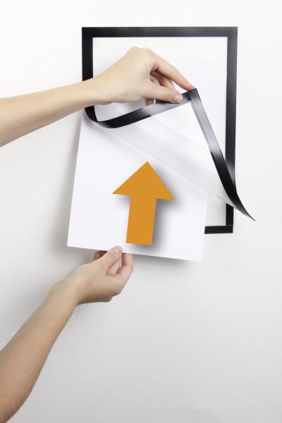 Praktični samolepilni magnetni okvirji z odprto prednjo stranjo za enostavno vstavljanje letakov in obvestil na katere lahko po potrebi pišete. Samolepilno hrbtišče okvirja deluje po sistemu prilepi odlepi in ga lahko prilepite na kakršnokoli gladko in trdno površino ter ga po potrebi tudi prestavite, ne da bi pri tem ostali madeži na površini. Sprednji del okvirja je odprt, tako da lahko na vstavljene liste pišete ne da bi odmaknili sprednji okvir. Pod okvir lahko vstavite do pet listov formata. Zanka za vstavljanje pisal. Sprednji del okvirja je magneten in omogoča hitro in enostavna menjavo listov. Izogibajte se uporabi na poroznih in nelepljivih površinah kot so npr. tapete. Pred uporabo površino očistite prahu, maščob in ostalih nečistoč. Ne uporabljajte na sveže lakiranih površinah. Priloženi so 4 trakovi za zamenjavo.