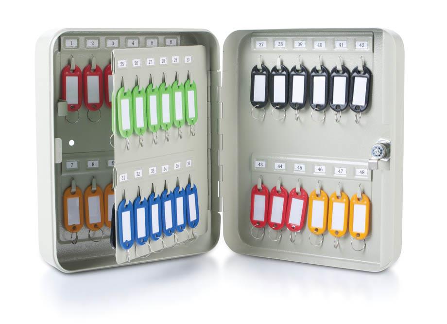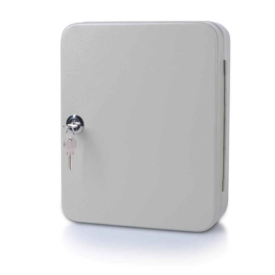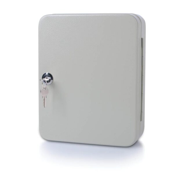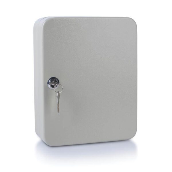 Kovinska stenska omarica za urejeno in pregledno shranjevanje ključev. Omarica je izdelana iz močne kovine in je namenjena pritrditvi na steno. Ima cilindrično ključavnico ter kljukice za pregledno obešanje ključev. Priloženi so obeski za ključe v sortiranih barvah.